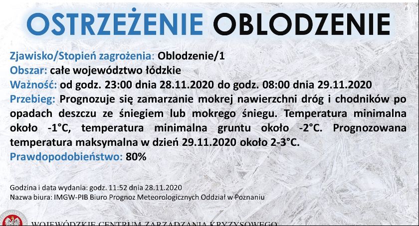 Instytut Meteorologii i Gospodarki Wodnej wydał komunikat, którym ostrzega o oblodzeniu dróg i chodników w całym województwie łódzkim. Apelujemy o ostrożność.