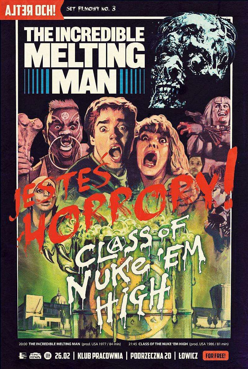 Po filmach sensacyjnych i science-fiction nadszedł czas na horrory. Zgodnie z zamysłem alternatywnej sekcji festiwalu, próżno szukać tu wybitnych dzieł kinematografii. Podczas piątkowego, bezpłatnego setu „Jesteś horrory!” w klubie Pracownia zostaną wyświetlone dwie amerykańskie produkcje The Incredible Melting Man (pol. Człowiek, który się zmieniał) oraz Class of Nuke "Em High (pol. Napromieniowana klasa). Co ciekawe, oba filmy zostaną zaprezentowane z polskimi, a dokładniej łowickimi, tłumaczeniami!