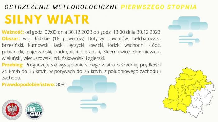W naszym regionie Instytut Meteorologii i Gospodarki Wodnej - IMGW PIB wydał ostrzeżenie meteorologiczne I stopnia dotyczące silnego wiatru.