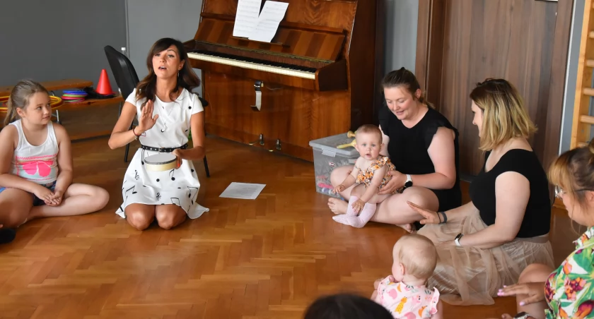 Kilkuosobowa grupa dzieci wraz z opiekunami brała udział w różnorodnych zabawach ruchowych przy dźwiękach m.in. fortepianu czy bębenka.