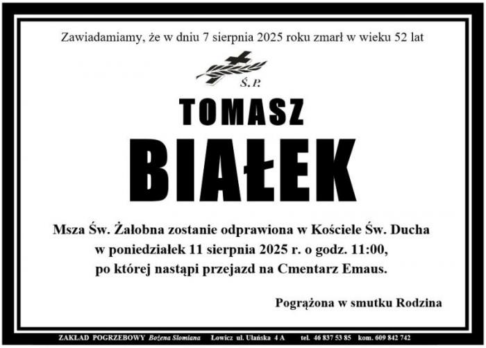 Msza święta żałobna za śp. Tomasza Białka odprawiona zostanie w poniedziałek, 11 sierpnia, o godz. 11.00 w kościele pw. św. Ducha w Łowiczu, po której nastąpi przejazd na cmentarz Emaus.