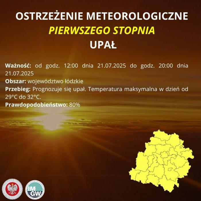 Instytut Meteorologii i Gospodarki Wodnej – Państwowy Instytut Badawczy wydał ostrzeżenie meteorologiczne pierwszego stopnia dotyczące upałów.