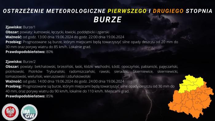 Instytut Meteorologii i Gospodarki Wodnej – Państwowy Instytut Badawczy wydał ostrzeżenie I i II stopnia dotyczące silnego deszczu z burzami dla województwa łódzkiego.