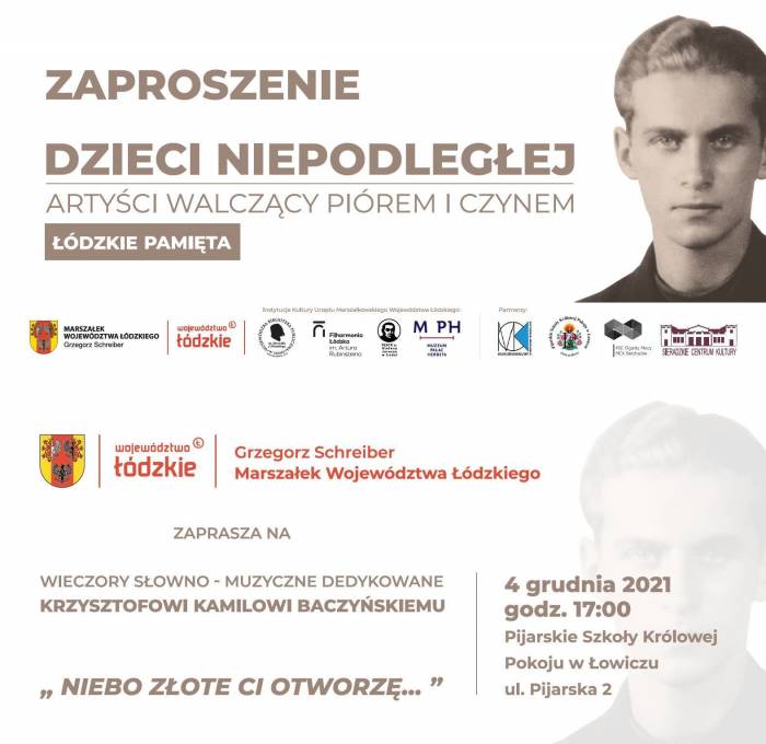 Marszałek Województwa Łódzkiego Grzegorz Schreiber zaprasza na wieczór słowno-muzyczny dedykowany Krzysztofowi Kamilowi Baczyńskiemu „Dzieci Niepodległej, artyści walczący piórem i czynem – „Niebo złote Ci otworzę…”.