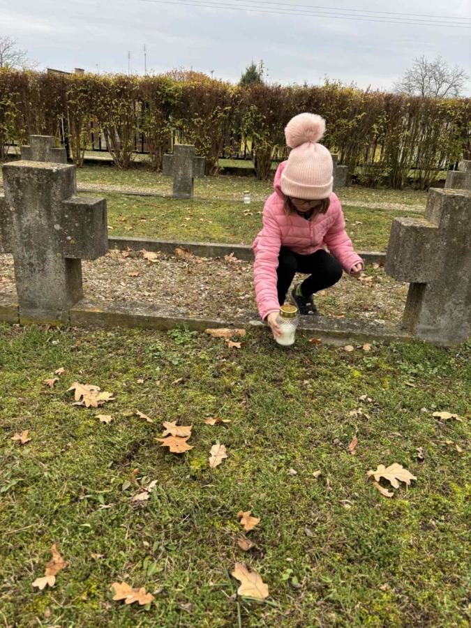 Pod opieką wychowawczyń dzieci symbolicznie posprzątały groby, uporządkowały liście i zapaliły znicze na znak pamięci o żołnierzach spoczywających na cmentarzu.