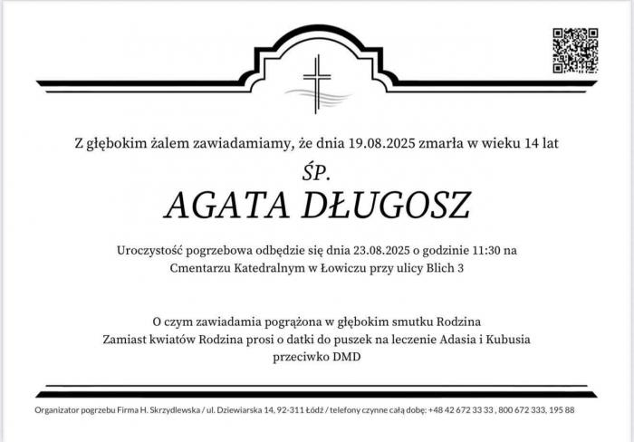 W najbliższą sobotę 23 sierpnia na cmentarzu katedralnym w Łowiczu odbędą się uroczystości pogrzebowe 14-letniej Agatki Długosz z Zielkowic. Zamiast kwiatów rodzina nastolatki prosi o wsparcie zbiórki dla chorych braci Adasia i Kubusia Strugińskich.