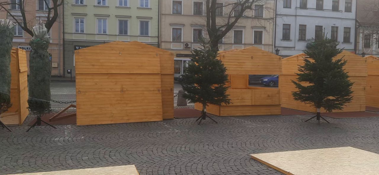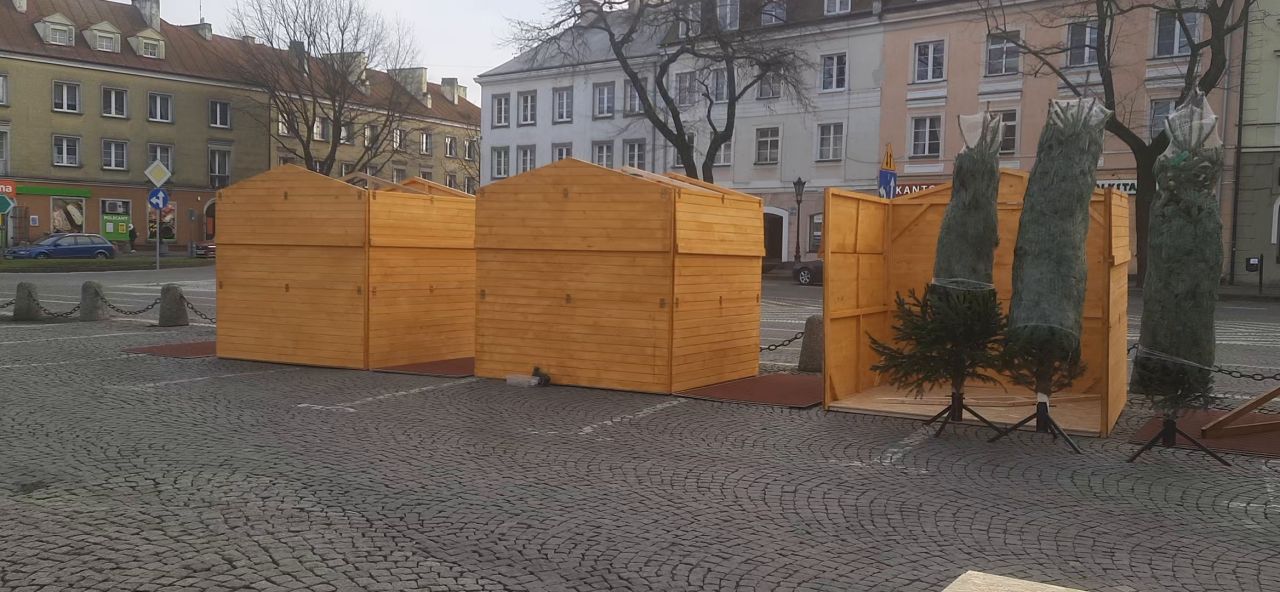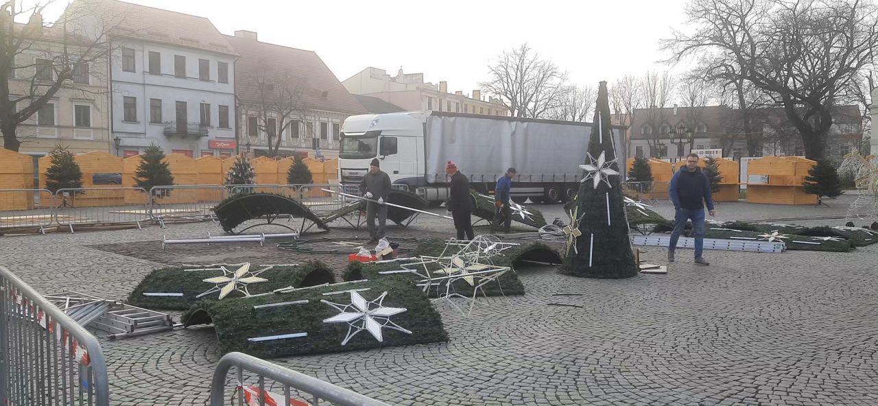 Wideo: Łowicz. Trwa montaż sztucznej choinki i drewnianych domków na Starym Rynku (foto, film)