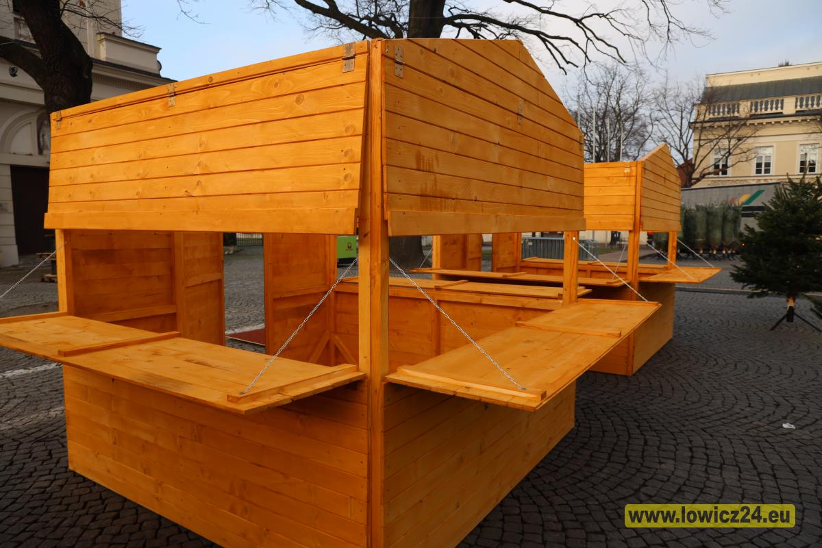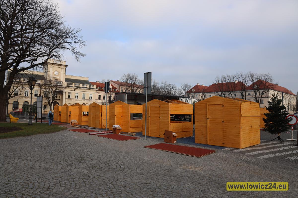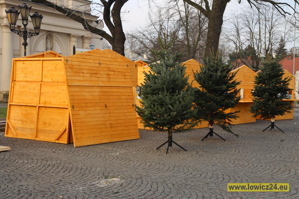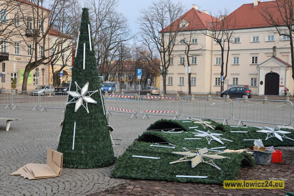 Łowicz. Trwa montaż sztucznej choinki i drewnianych domków na Starym Rynku (foto, film)